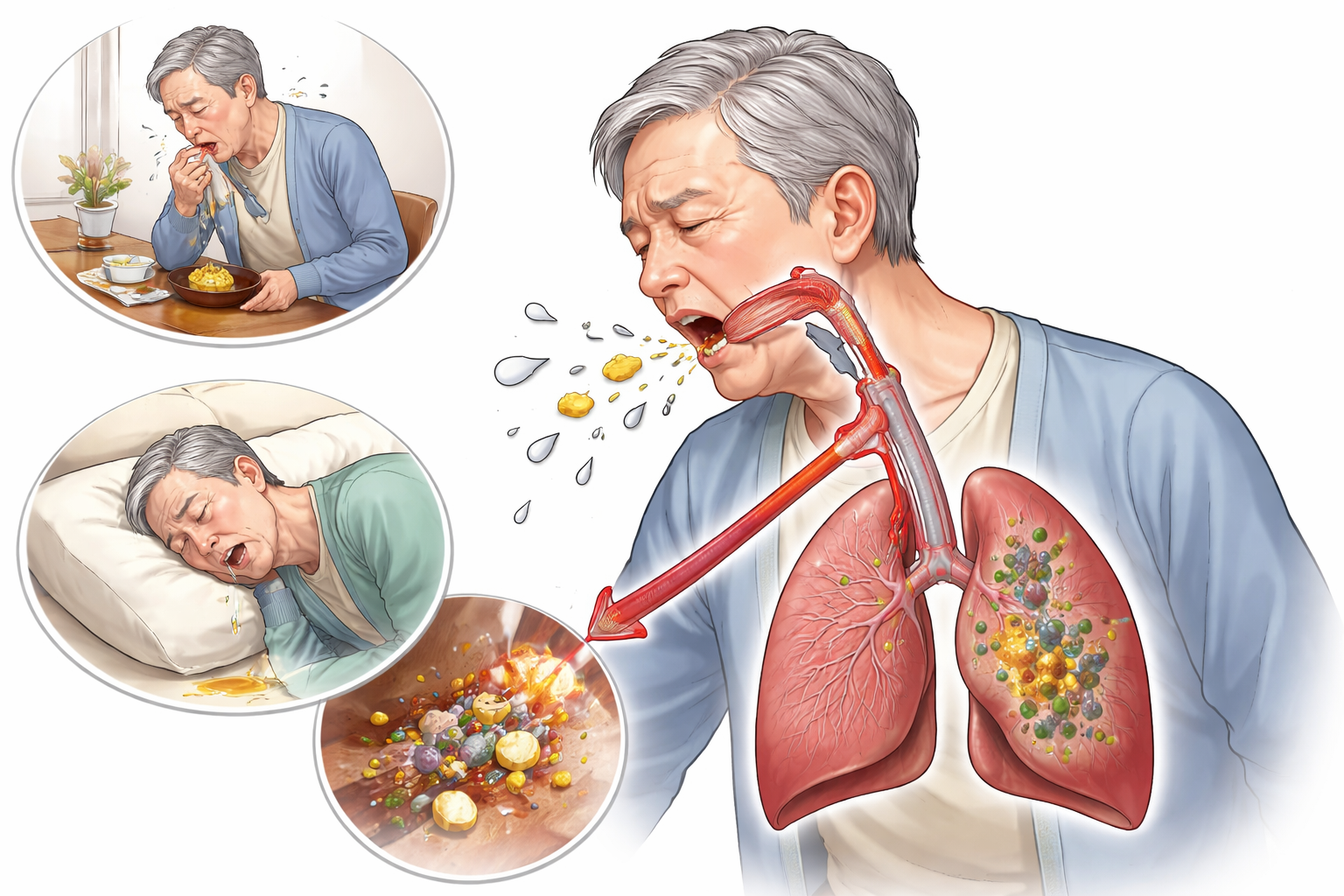 ポイント: 食べ物だけでなく、寝ている間に「細菌まみれの唾液」が少しずつ肺に入ることで起こるケースも多いんです。