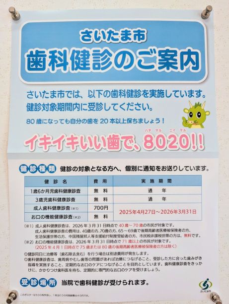 '25.10.29当医院では、さいたま市の歯科健診を行っております